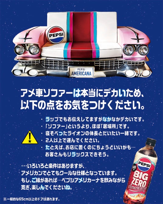 「ペプシBIG ZERO Americana」の発売を記念して、本物のアメ車を使用して制作した「アメ車ソファ」が抽選で1名様に当たるキャンペーンを実施します。景品の郵送に当たり、応募条件が設定されています。応募の際は、キャンペーン特設サイトの応募要件をよくご覧ください。