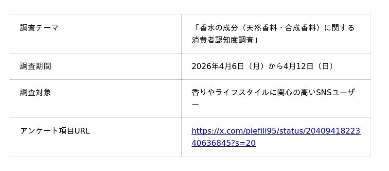 本調査は、2026年4月6日(月)から4月12日(日)の期間、PIEFILI公式X(@piefili95)にて実施いたしました。香りやライフスタイルに関心の高いSNSユーザーを対象にアンケートを行い、貴重な回答を収集しました。