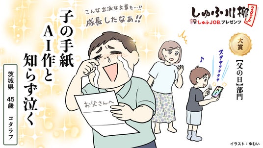 ■川柳投稿エピソード:本当によくできています。 <審査員コメント ※敬称略>川上:お父さんの様子を想像して、微笑ましさとその後の落差に思わず吹き出しました。「AIが作ったんかい!」とツッコみたくなりますが、それでも子どもからもらう手紙は無条件に嬉しいものですよね。修士:読書感想文もAIが作る時代、親への手紙もAIでしょうそりゃあ。もう結婚式の父親の手紙もそうなるじゃないですか。小堀:本当にある話だと思います。僕は泣いてしまうと思いますけど!