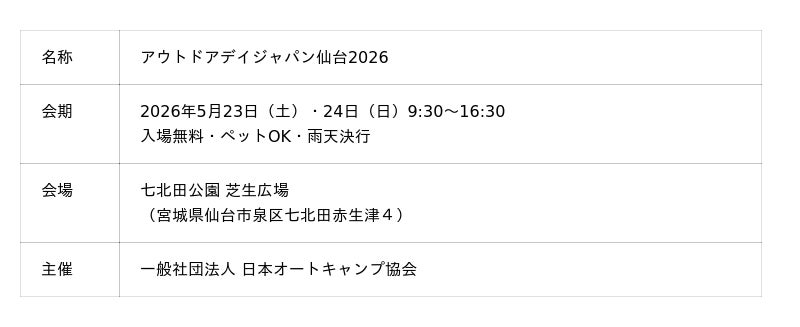株式会社ホンダアクセスは、2026年5月23日(土)・24日(日)に七北田公園 芝生広場(宮城県仙台市)で開催されるアウトドアイベント「アウトドアデイジャパン仙台 2026」にHondaキャンプとして出展します。アウトドアデイジャパンは、国内最大級の体験型アウトドアイベントで、人々の生活圏内の公園でアウトドア関連製品に実際に触れることで、アウトドアへの理解や親しみを増すことができるイベントです。