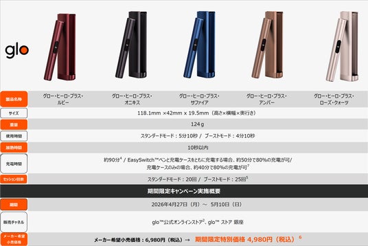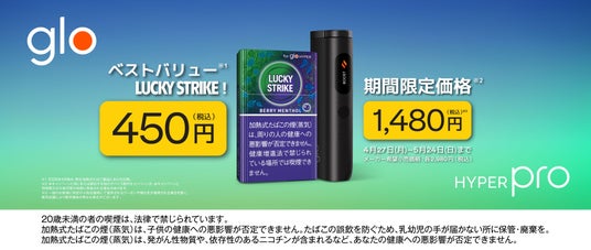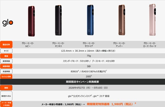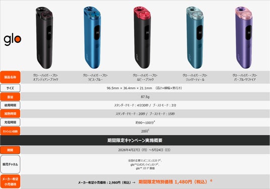 ブリティッシュ・アメリカン・タバコ・ジャパン合同会社(本社:東京都港区、代表:マウリシオ・ララ、以下「BATジャパン」)は、2026年4月27日(月)から5月24日(日)までの期間、加熱式たばこデバイス「glo(TM) Hyper Pro(グロー・ハイパー・プロ)」の全5カラーを対象に、期間限定の特別価格1,480円(税込)で販売するキャンペーンを実施します。