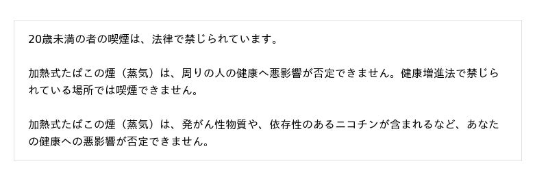 BATグループでは、たばこ製品のマーケティングを適切に実施するために国際的な自主規準を設定しています。そのため消費者に対するたばこ製品に関するすべてのコミュニケーションには、20歳未満の方へのコミュニケーションをお控えいただくとともに、「喫煙と健康に関する注意文言」を表示することを関係各位にお願いしております。加熱式たばこに関しては、記事掲載していただく際には、「健康に関する注意文言」が表示されるようご配慮いただきたく存じます。ご協力の程、何卒よろしくお願い申し上げます。