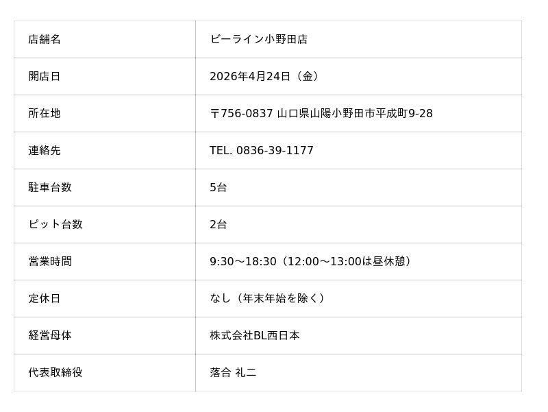 株式会社オートバックスセブン(代表取締役 社長:堀井勇吾)の連結子会社である株式会社BL西日本(代表取締役:落合礼二)は、「ビーライン小野田店」を2026年4月24日(金)にオープンいたします。