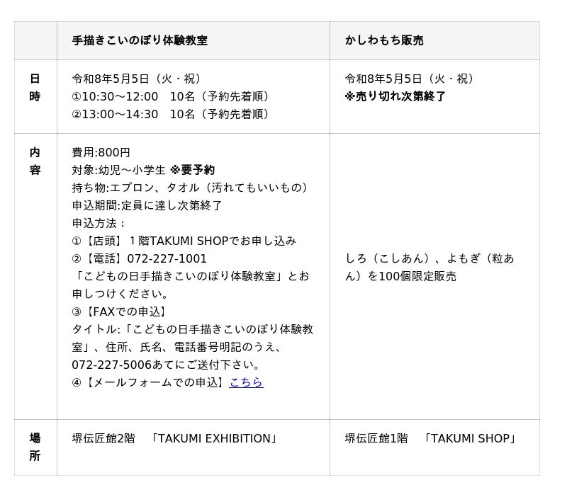 堺の伝統工芸と季節の和菓子を同時に楽しめる、こどもの日にふさわしい特別な一日です。ぜひご家族そろってお越しください。