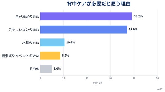 シーズ・ラボが実施した調査では、背中ケアが必要だと感じる理由として「自己満足のため」39.2%、「ファッション(背中の開いた服など)のため」36.9%が上位で、「結婚式やイベントのため」は8.6%にとどまっており、特別な日のためだけではない日常的な美容ニーズがうかがえます。