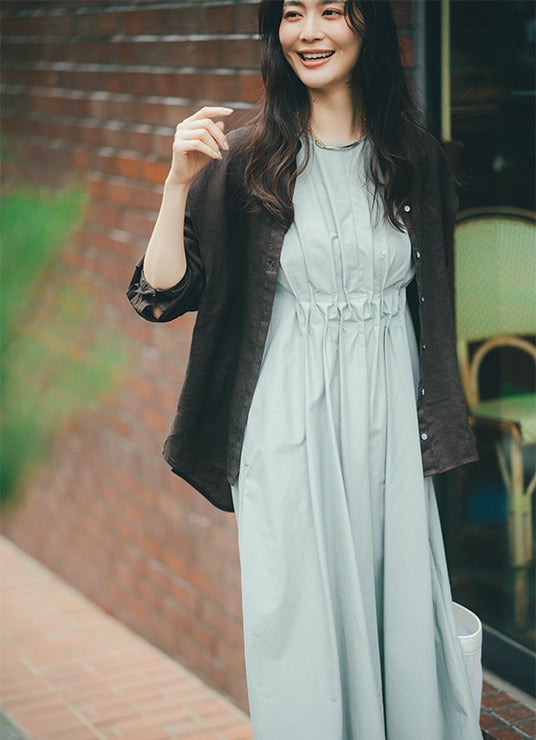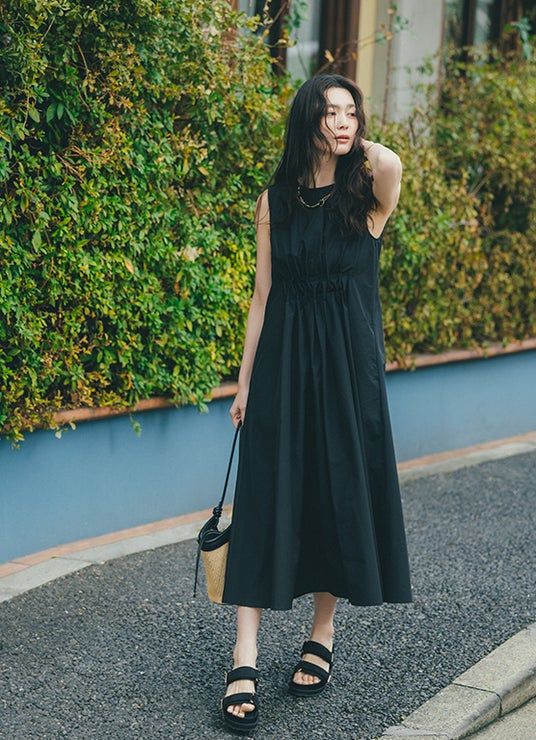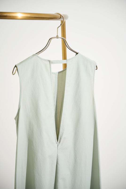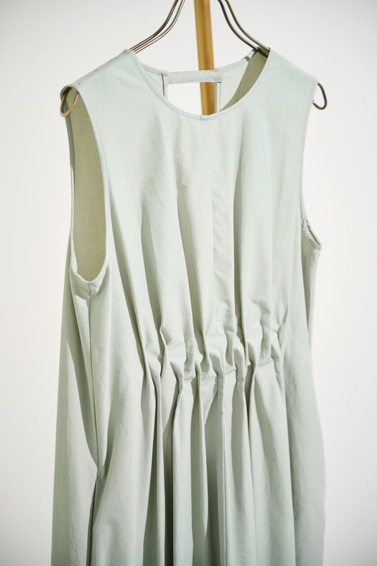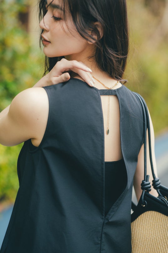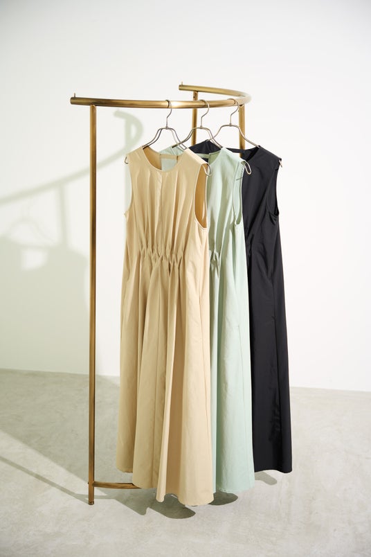 ウエスト位置を高めに設定したタックデザインにより、脚長効果とスタイルアップを両立。体からつかず離れずのリラクシーな着心地ながら、Aラインシルエットが細見えを叶えます。一番の魅力は計算し尽された潔いバックシャンデザイン。ヘルシーな肌みせが美しさと抜け感を最大限に引き出します。ドライな肌触りでマシンウォッシャブル・ノンアイロンはもちろん、撥水・UVカットの機能も。