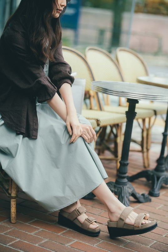 ベースはスポーティでヘルシーなデザイン。そこにさりげなくあしらわれた「メタルパーツ」が洗練されたアクセントをプラスします。ラフになりすぎない一足に仕上げました。足を美しく長く見せる「6cm」の厚底ソール。前側に3cmの厚みを持たせることで傾斜をゆるやかに。足への負担が少なく、安定感も抜群です。