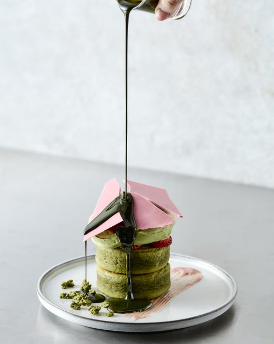 宇治抹茶を使用した香り高い生地に、コクのある抹茶クリーム、ハーゲンダッツ ストロベリーアイス、フランボワーズソースを合わせた一皿。ストロベリーチョコレートを割った後、濃厚な抹茶ソースをかけることで、甘み・ほろ苦さのバランスが変化する“味変”を楽しめる体験型パンケーキです。