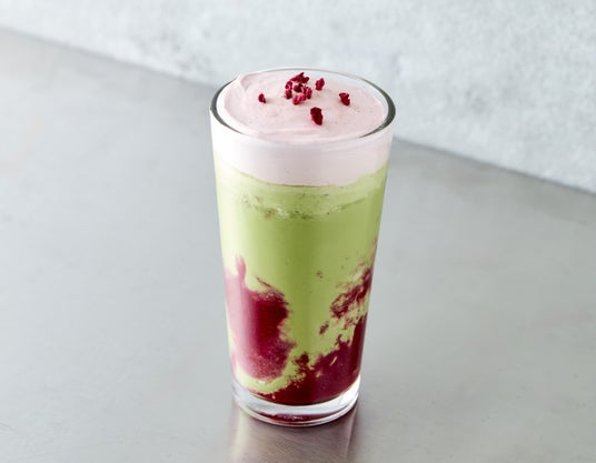 ほろ苦くコクのある抹茶シェイクに、ストロベリークリームと甘酸っぱいベリーソースを合わせた一杯。グリーンとピンクが混ざり合う、ムーディーで可愛らしいカラーリングも魅力。混ぜ合わせるごとに表情が変わる、フォトジェニックな見た目とともに爽やかな味わいをお楽しみください。
