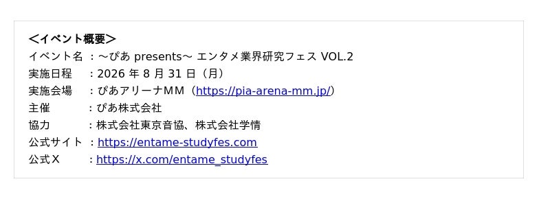 平素は大変お世話になっております。このたび、8 月 31 日(月)にぴあアリーナMMにて 『~ぴあ presents~ エンタメ業界研究フェス VOL.2』を開催する運びとなりましたので、 ご案内申し上げます。
