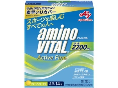 ●製品名:「アミノバイタル(R) アクティブファイン(R)」14本入り箱●特長:スポーツ時に失われがちな大切なアミノ酸2,200mg(ロイシン高配合必須アミノ酸全9種(LEAA)1,250mg、グルタミン650mg、アルギン300mg)を素早く補給できます。スポーツを楽しむすべての方、日々快適に運動を続けたい方におすすめです。さっと口どけの良い顆粒状で、飲みやすいグレープフルーツ味(無果汁)。