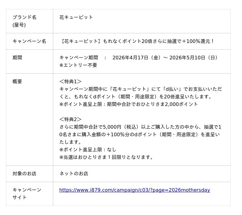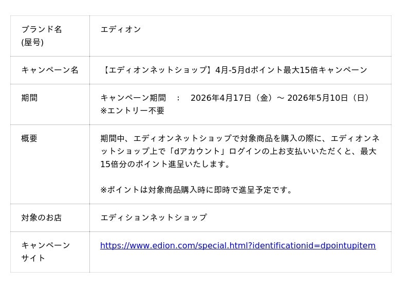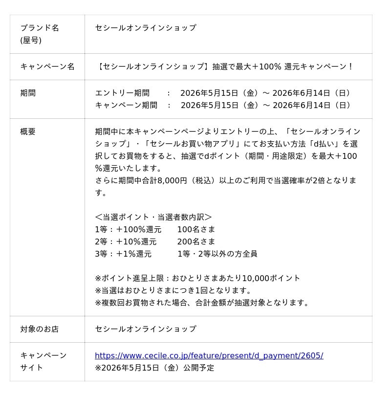 株式会社NTTドコモ(以下、ドコモ)は、「dポイント」「d払い(R)」においておトクなキャンペーンを開催いたします。詳細は、下表のとおりです。