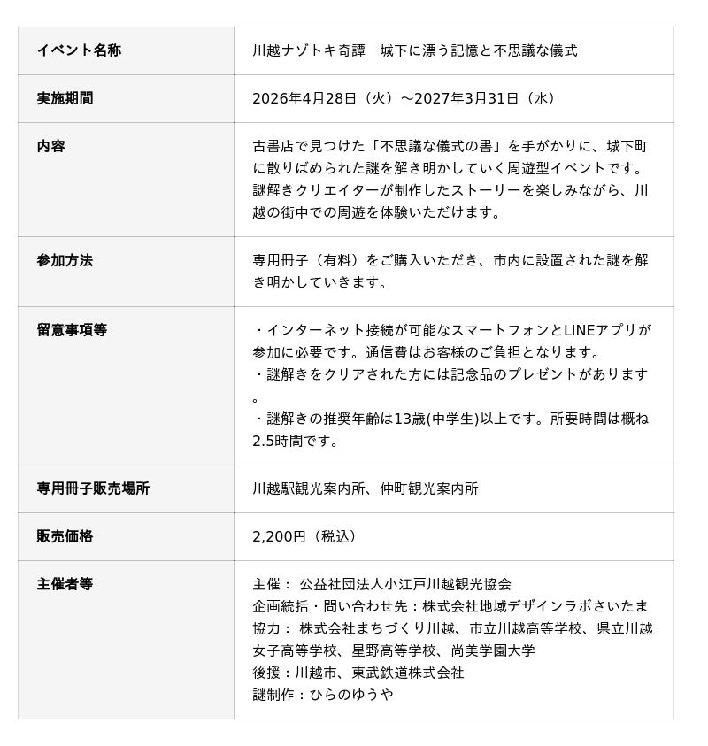 りそなグループの地域デザインラボさいたま(社長:園田 孝文、以下「ラボたま」)は、人気観光地・川越市が抱えるオーバーツーリズムの課題に向き合う新たな観光施策として、公益社団法人小江戸川越観光協会(以下、小江戸川越観光協会)が主催する謎解きを活用した周遊型イベントを企画・支援しました。本取り組みは、産官学が協働して地域の魅力を再発見するプロジェクトであり、市内の学生が情報収集やプロモーション活動に参画することで、若い視点を取り入れた新しい川越体験を創出しています。 本イベントは、2026年4月28日より販売を開始いたします。