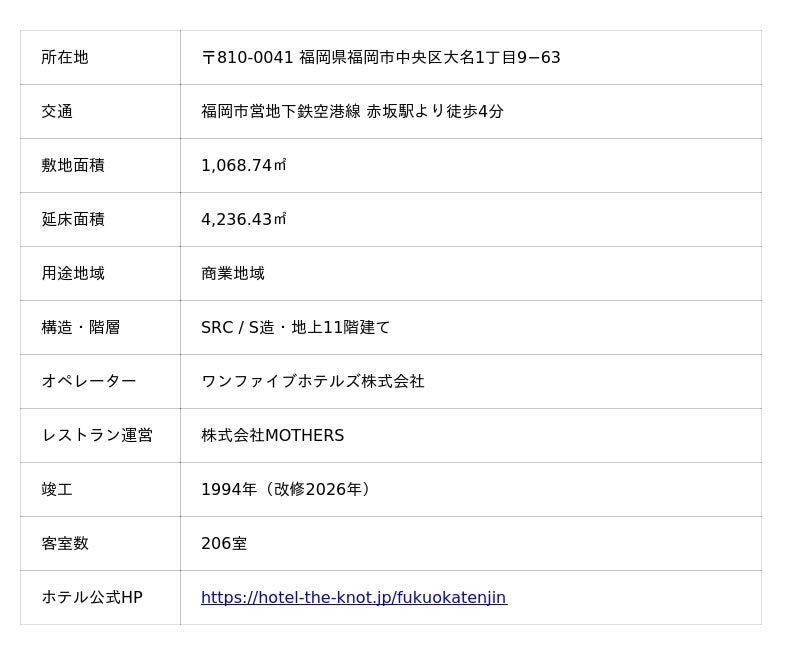 「THE KNOT FUKUOKA Tenjin(ザ ノット 福岡天神)」が開業いたしました。本ホテルは、当社が取得した旧プラザホテル天神を全面改修しており、いちごグループのワンファイブホテルズ株式会社がホテルを運営いたします。