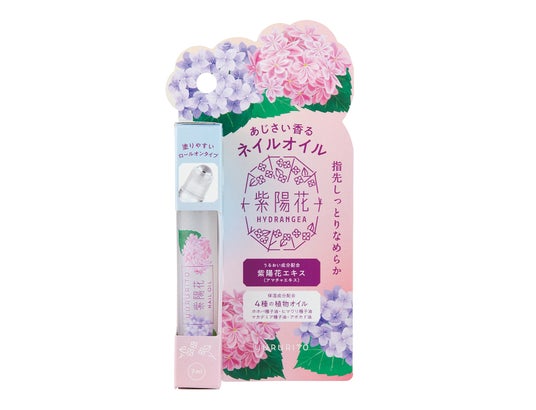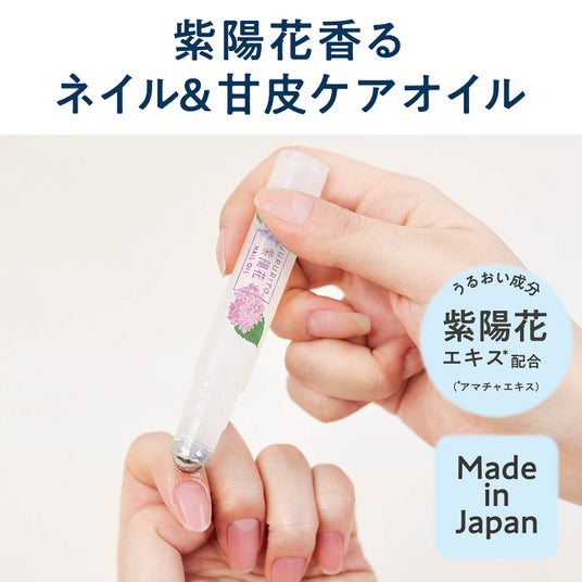 指先・爪・甘皮のケアに、紫陽花香るネイルオイル。紫陽花エキス(アマチャエキス)と4つの植物オイル配合でうるおしながら健やかで美しい指先に。塗りやすいロールオンタイプです。