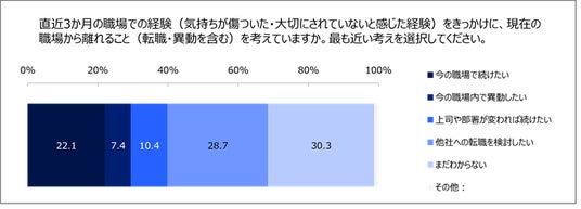 さらに、傷ついた経験をきっかけに、現在の職場から離れる可能性(転職・異動を含む)を聞いたところ、「他社への転職を検討したい」と回答した人は28.7%にとどまるものの、「今の職場で続けたい」(22.1%)、「上司や部署が変われば続けたい」(10.4%)「今の職場内で異動したい」(7.4%)となりました。