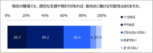 また、傷ついたときに適切な支援や関わりがあれば、前向きにはたらける可能性があるかを尋ねたところ、約60%が「ある」と答えました。(「十分ある」(20.7%)、「ややある」(39.2%))。