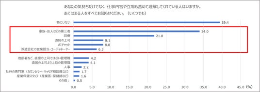 また、気持ちや立場を理解してくれる存在としては、約4割が「特にいない」と回答する一方、理解してくれる存在がいると回答した方の中では、「家族・友人などの第三者」(34.0%)が最も多く、次いで「同僚」(21.8%)、「直属の上司」(8.1%)となりました。社内の人(上司や管理職、同僚、人事など)よりも、利害関係がなく話しやすい関係性がある第三者に相談する人が多い傾向があることがわかりました。