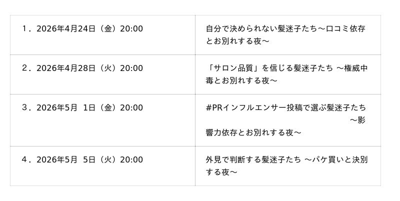 - 「口コミ」「サロン品質」「#PR投稿」「パケ買い」誰もが覚えのある「髪迷子」悩みに真正面から切り込み、見終わる頃には思わずシャンプーの裏面を確認したくなるきっかけに。