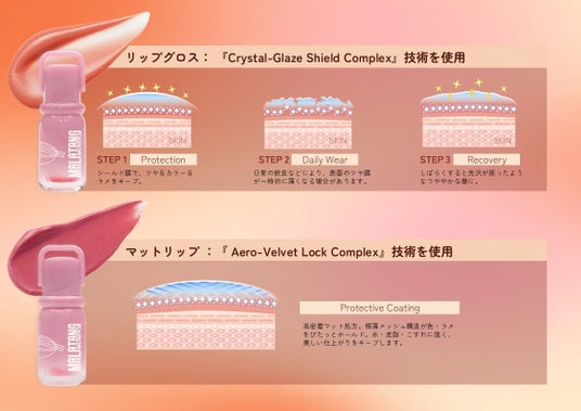 落ちにくさの秘密は、独自の成膜技術により形成される「色持ちキープ膜」。グロスタイプは塗布後、約90秒待つことでツヤのある膜が形成され、食事でくずれが気になっても時間とともにツヤ感が整い、塗りたてのような仕上がりへと導きます。マットタイプは極薄メッシュ構造が唇に密着し、水分・油分・摩擦等による崩れを防ぎながら乾燥による縦ジワもぼかし、ふんわりとした質感をキープ*します。*当社調べ