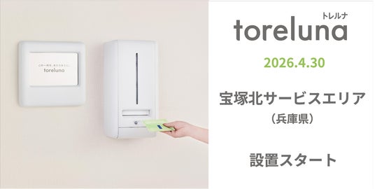 株式会社ネクイノ(大阪市北区、代表取締役:石井 健一)は、トイレの個室で生理用ナプキンを常備し無料で提供するサービス「toreluna(トレルナ)」(以下 トレルナ)を、宝塚北サービスエリアへ設置し、サービスの提供を開始いたします。なお、トレルナのサービスエリアへの導入は、今回が初めての取り組みとなります。