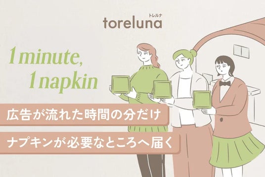 トレルナでは、個室内でのナプキン提供に加え、全国のトレルナ設置箇所で広告が1分放映されるごとに1枚の生理用ナプキンを必要な場所へ届ける『1minute,1napkin』を実施しています。トレルナデジタルサイネージへの広告出稿が社会課題の解決につながる取り組みとして、パートナー企業とともに、自治体や学校、被災地など、生理用品を必要とする地域・団体へ届ける仕組みです。