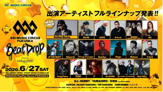 株式会社 TryHard Japan(NASDAQ: THH 上場 TryHard Holdings Limitedの子会社)は、福岡ソフトバンクホークス株式会社(本社:福岡市中央区、代表取締役社長CEO:後藤 芳光)と共催で、2026年6月27日(土)にみずほPayPayドーム福岡にて開催する「SBI MUSIC CIRCUS FUKUOKA -Beat Drop- partner with SoftBank HAWKS」の出演者フルラインナップ情報を発表しました。