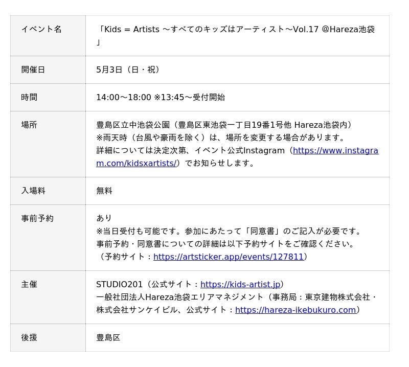 東京建物株式会社と株式会社サンケイビルの2社が事務局を務める一般社団法人Hareza池袋エリアマネジメントは、STUDIO201と共同で、子どもたちの自由な発想とアーティストの感性を融合させるアートイベント「Kids = Artists ~すべてのキッズはアーティスト~」を5月3日(日・祝)に「Hareza池袋」にて開催します。