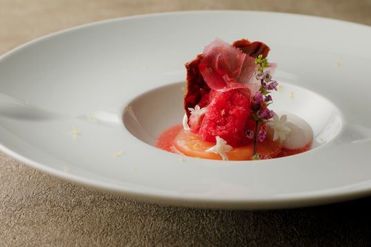「帆立貝 燻製 ピンクグレープフルーツ」は、グリルした帆立貝をマリネし、ピンクグレープフルーツやレモングラスのゼリー、フィンガーライム、燻製したフロマージュブランを添えたやわらかな酸味と柑橘の香りを味わう一品。海のさざ波を表現したタピオカチップの食感がアクセントになります。