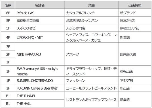 ライフスタイル、カルチャー、食、ビジネスといった多彩な分野で、話題性と体験価値を兼ね備えた個性豊かな店舗が集結することにより、原宿の魅力をさらに引き出し、幅広いニーズにお応えしてまいります。