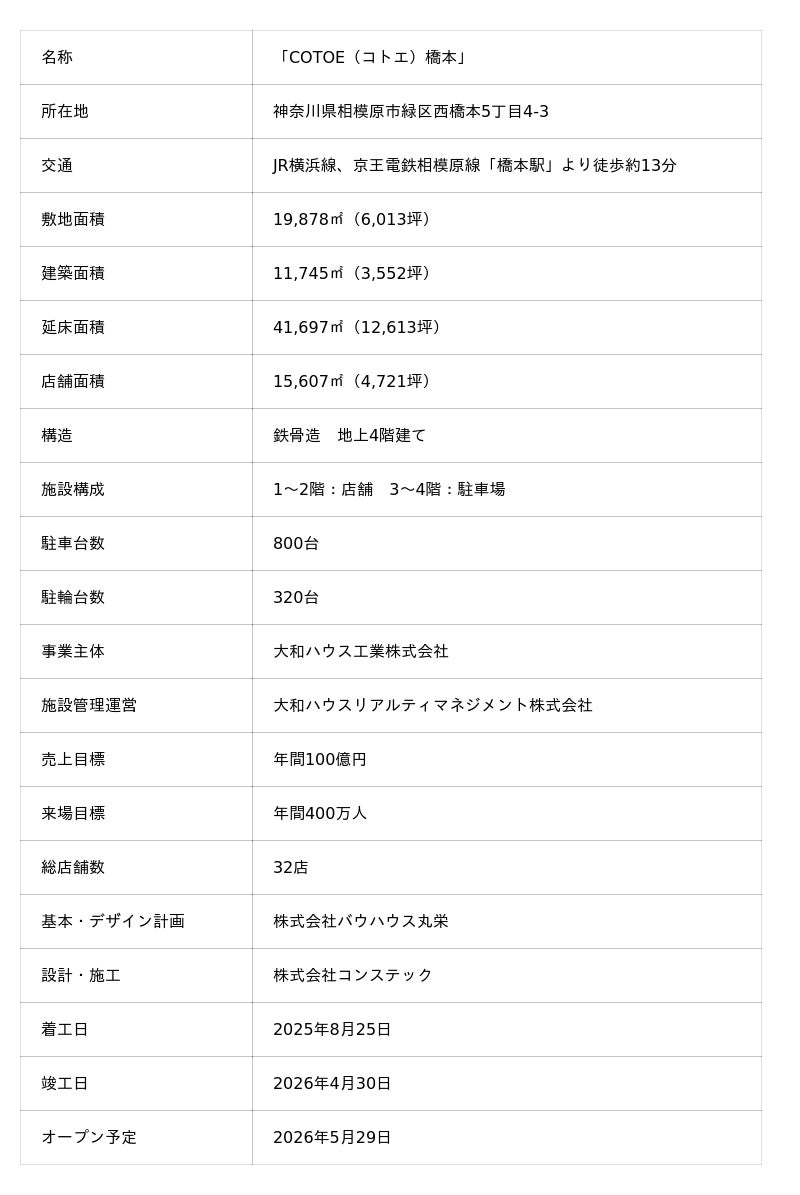 大和ハウス工業株式会社(本社:大阪市、社長:大友 浩嗣)は、神奈川県相模原市緑区において開発を進めている複合商業施設「COTOE(コトエ)橋本」を、2026年5月29日(金)に開業します。