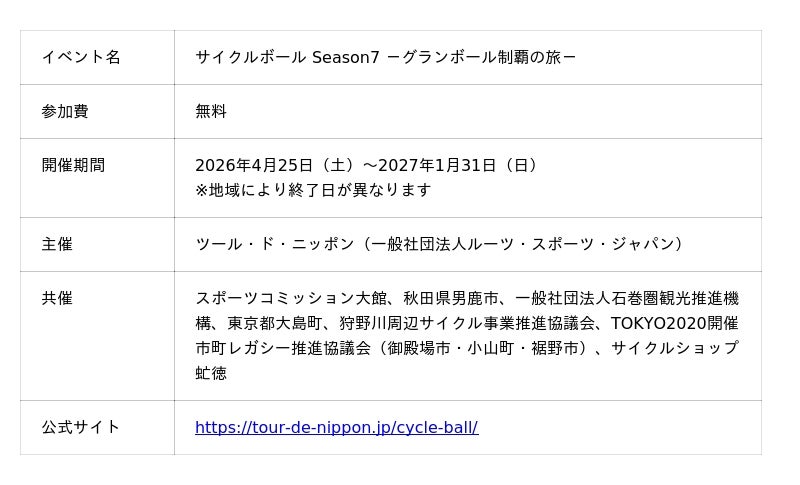 「日本にスポーツを根づかせる。」を理念に掲げ、全国でサイクルツーリズム事業を展開する一般社団法人ルーツ・スポーツ・ジャパン(所在地:東京都新宿区、代表者:中島 祥元、以下「RSJ」)は、サイクリングアプリ「TraVelo(トラベロ)」を使って日本各地の1周コースを走る期間型イベント「サイクルボール Season7 -グランボール制覇の旅-」を2026年4月25日(土)より開催いたします。