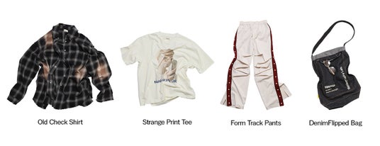 「Strange Print Tee」は、見覚えがあるようでいてはっきりしないグラフィックを採用したヴィンテージTシャツ。着る人によって異なる解釈が生まれるデザインです。「Old Check Shirt」はヴィンテージの風合いを再現したチェックシャツ。「Denim Flipped Bag」は内側と外側を反転させた構造のトートバッグで、普段は見えない面をあえて表に出しています。「Form Track Pants」は一見シンプルなシルエットながら、着用時に気づく独自のラインを持たせたトラックパンツです。