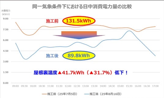 空調消費電力:最大 31.7% 削減(平均18.1%減)屋根表面温度:最大 34.3℃ 低減屋根裏温度:最大 9.7℃ 低減
