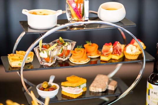 <フード>野菜スティック 白味噌ディップ/ミックスナッツ/キッシュ/チェリートマトとモッツァレラチーズ/スモークサーモンとブリニ/生ハムと季節のフルーツ/小エビのタルトレット/京都ポークのパテ・ド・カンパーニュ/オリーブ/サンドイッチ/フレンチフライ