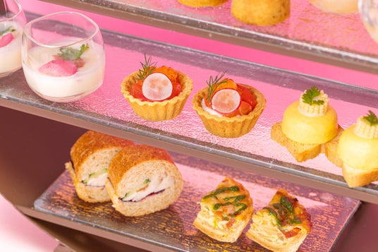 <セイボリー>桃のヴィシソワーズ 生ハム添え/マリネサーモンと桃のタルトレット/トウモロコシのムース/トマトとバジルのキッシュ/鶏胸肉と紀州南高梅のサンドイッチ