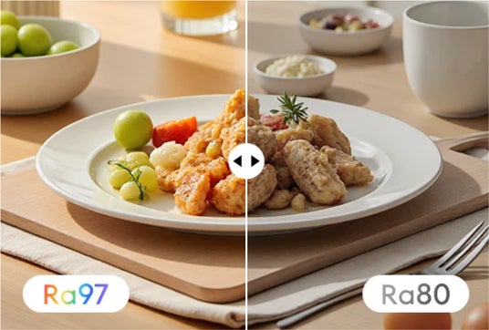 「どんよりした天気や室内光で、せっかくの『料理』や『インテリア』がくすんで見える」という不満を解消するため、世界最高水準の色彩再現性(Rf97 / Rg102)を紹介。