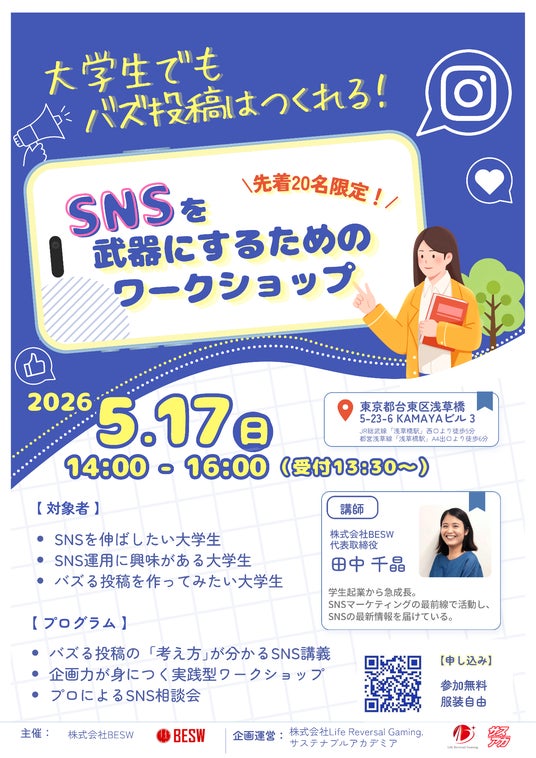 2026年5月17日(日)、現役大学生を対象とした実践型ワークショップ『大学生でもバズ投稿はつくれる!~SNSを武器にするためのワークショップ~』を開催いたします。