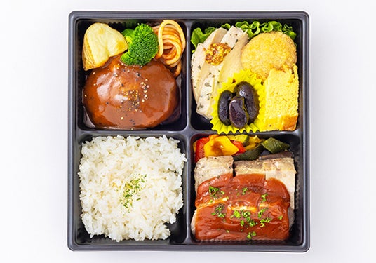 ハンバーグとポークを一緒に楽しめるよくばりなお弁当。