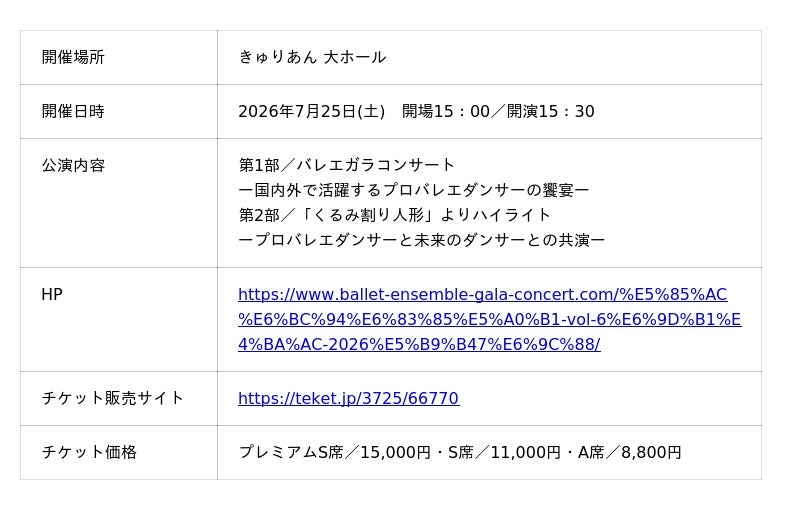 バレエ・ダンス用品のマーティ株式会社(本社:東京都港区三田2-14-4 三田慶応ビジデンス1F)が、バレエアンサンブルガラ2026公演を2026年7月25日(土)・2026年8月9日(日)に開催します。この公演は、国内外で活躍するプロダンサーとプロの世界を目指している未来のプロダンサーたちが共演するバレエ公演で、毎年、夏に開催されています。そんな本公演のチケットが2026年4月24日(金)18:00より発売されます。