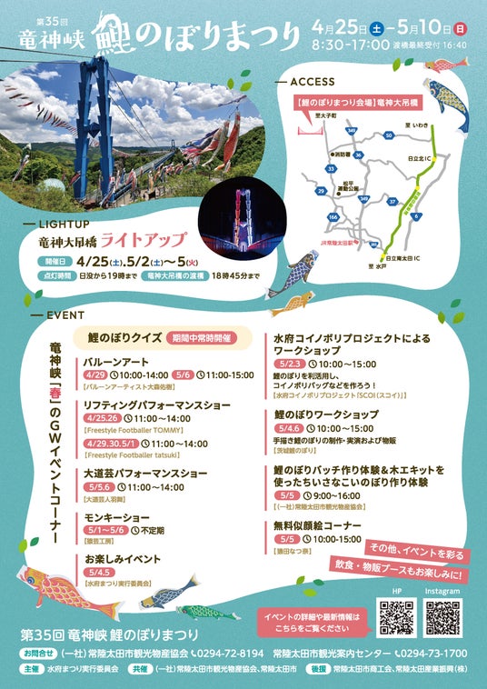 4月25日(土)から5月10日(日)まで開催。5月5日(火・祝)のこどもの日には、中学生以下の渡橋料が無料になります。GWはぜひ常陸太田市へお越しください!