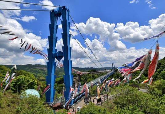 日本最大級の長さを誇る茨城県常陸太田市の竜神大吊橋(りゅうじんおおつりばし)で、4月25日(土)から5月10日(日)まで、「竜神峡鯉のぼりまつり」を開催します。鮮やかな新緑で彩る常陸太田市内を、約1,000匹の鯉のぼりが優雅に泳ぐ姿は、美しく大迫力!5月5日の子どもの日には、中学生以下の渡橋料が無料になります。