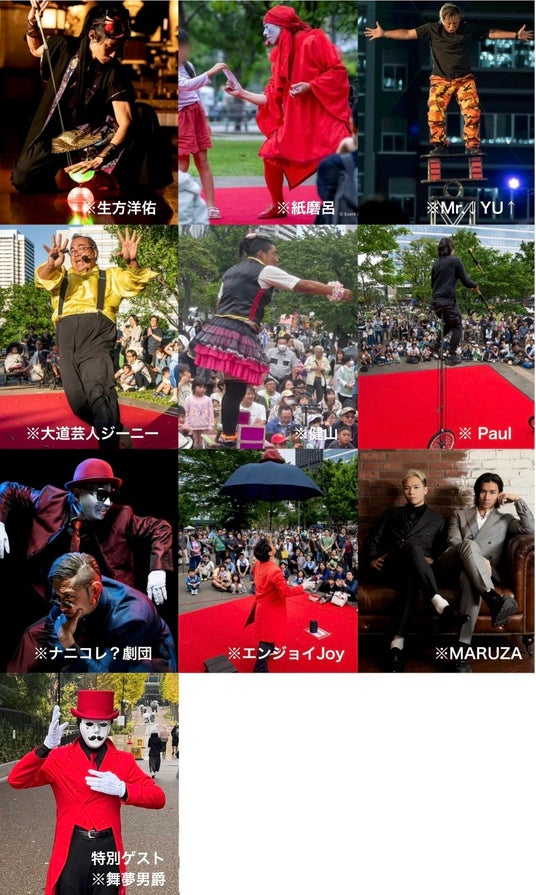 ※画像:出演者 上左より生方洋佑・紙磨呂・Mr.↓YU↑・大道芸人ジーニー・健山・ Paul・ナニコレ?劇団・エンジョイJoy・MARUZA・舞夢男爵