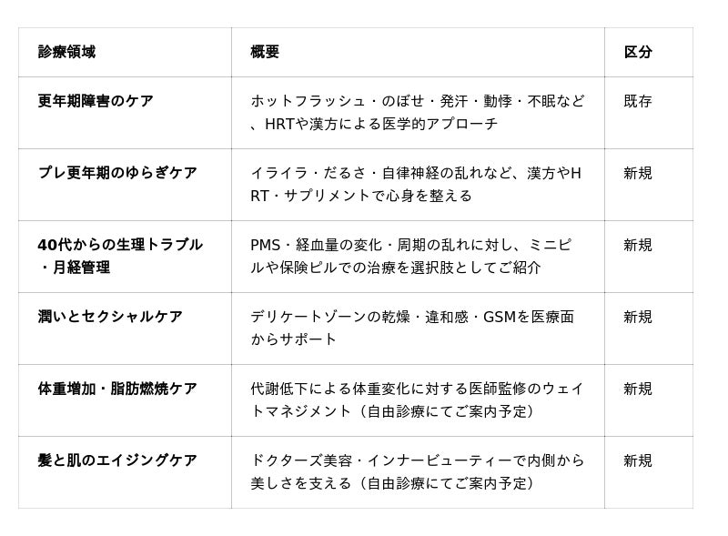 今回の拡大により、MYLILYは更年期世代の女性が日常で経験する幅広い不調に対し、以下の6つの領域で対応します。重い症状の治療から軽い揺らぎのご相談まで、症状の重さを問わずご利用いただけます。