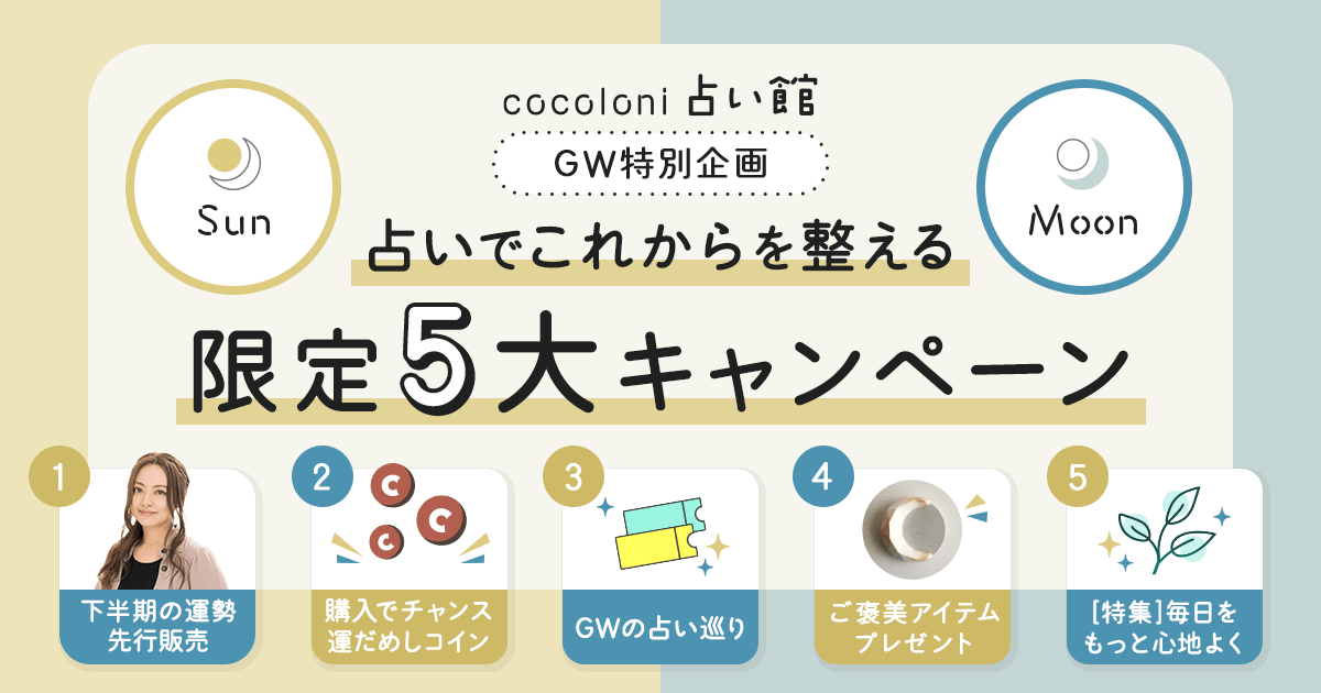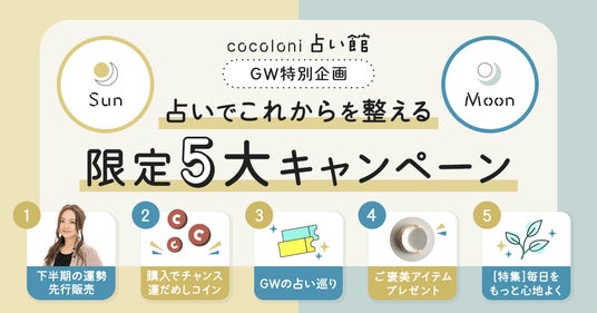 株式会社cocoloni(本社:東京都渋谷区、代表取締役:溝上雅俊)は、運営する占いコンテンツポータル『cocoloni占い館』にて、2026年4月27日(月)より「占いでこれからを整える 限定5大キャンペーン」を開催いたします。