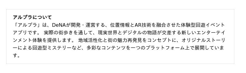 - 内容:ARアプリ「アルプラ」を使用した推理ミステリーの体験型イベント