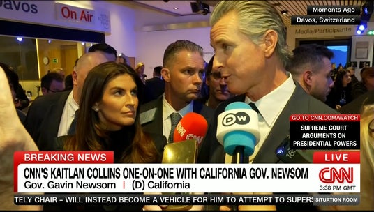 今年のダボス会議でニューサム州知事にインタビューするケイトラン・コリンズ