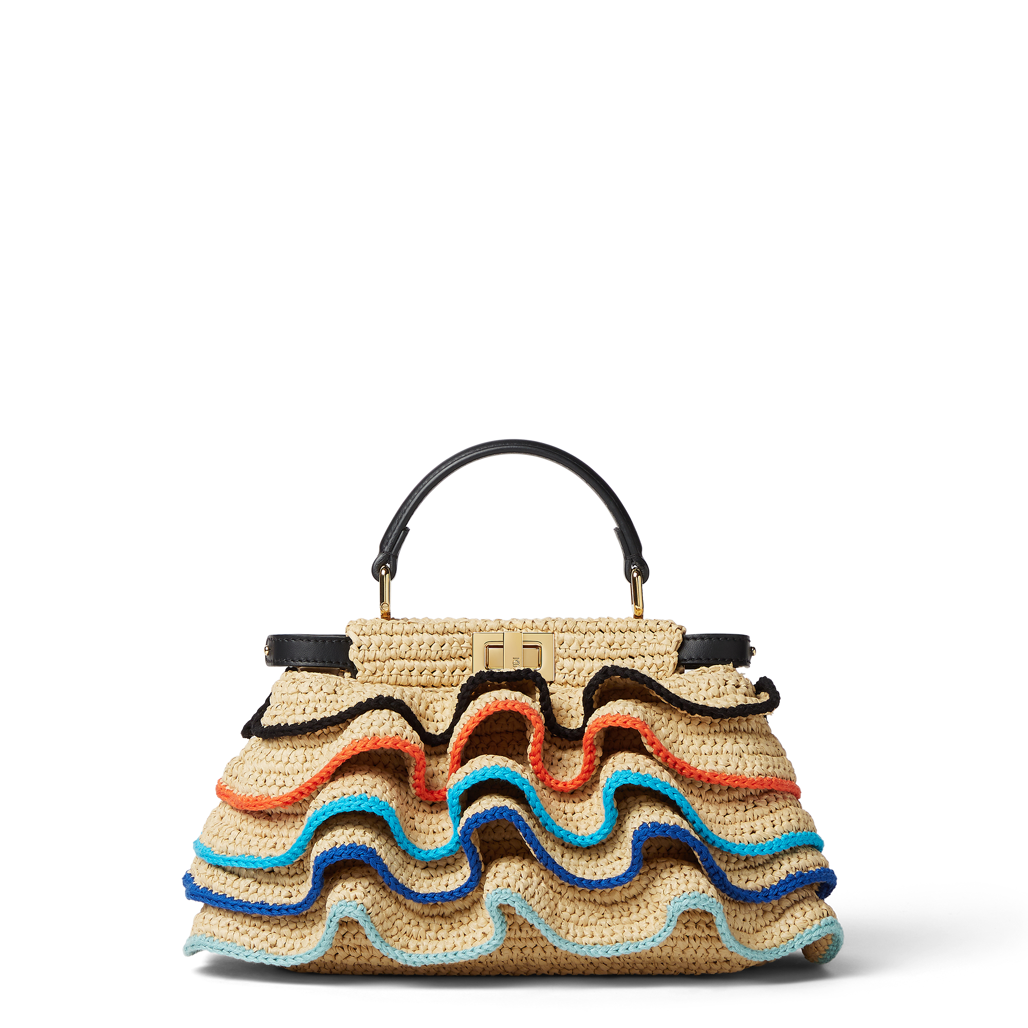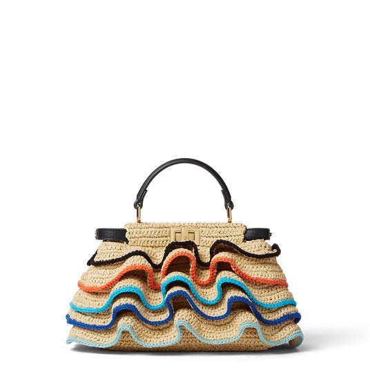 また、カラフルなルーシュデザインがひと際目を引くアイコンバッグ「ピーカブー(Peekaboo)」は、イタリアのルーツとヴェネツィアの詩的なささやきに触発されて誕生しました。FSC認証のビスコースラフィアを使用し、丁寧なカギ針編みで作り上げられたボディに、コスティエラ、テラコッタなど、カラフルな100%オーガニックコットンで縁取られたルーシュが加えられ、ヴェネツィアの水面に映る穏やかな夕日を彷彿とさせます。フェンディのクラフツマンシップが結集したこの美しい「ピーカブー」には、13時間に及ぶ手仕事が注がれています。