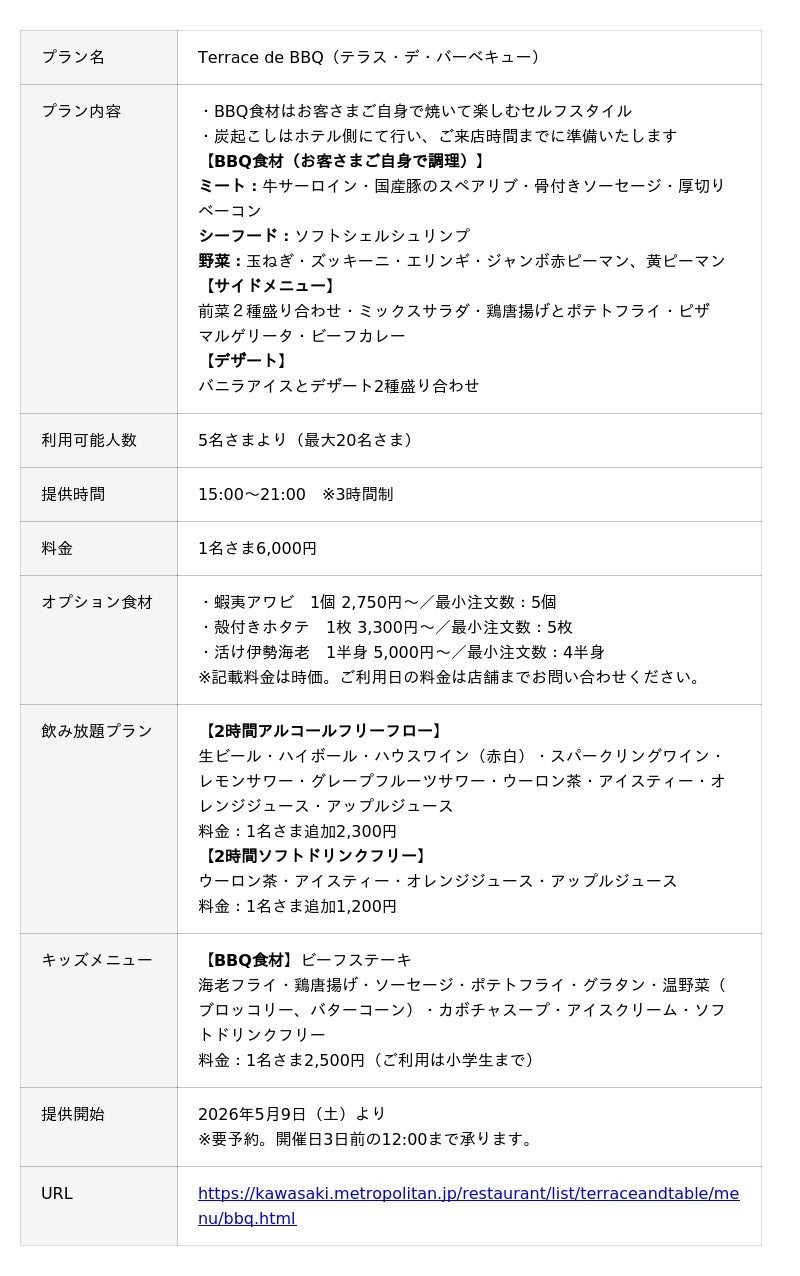 「Terrace de BBQ」として2026年5月9日(土)より提供開始し、本日よりご予約を承ります。