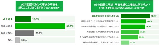 73.3%がAIの回答に不満や不安を感じたことがあると回答。理由1位は「最新情報かどうかわからなかった(43.2%)」で、次いで「根拠や検証データが示されず信頼性が低かった(36.8%)」、「なぜその商品が良いのか理由がわからなかった(35.9%)」という結果に。